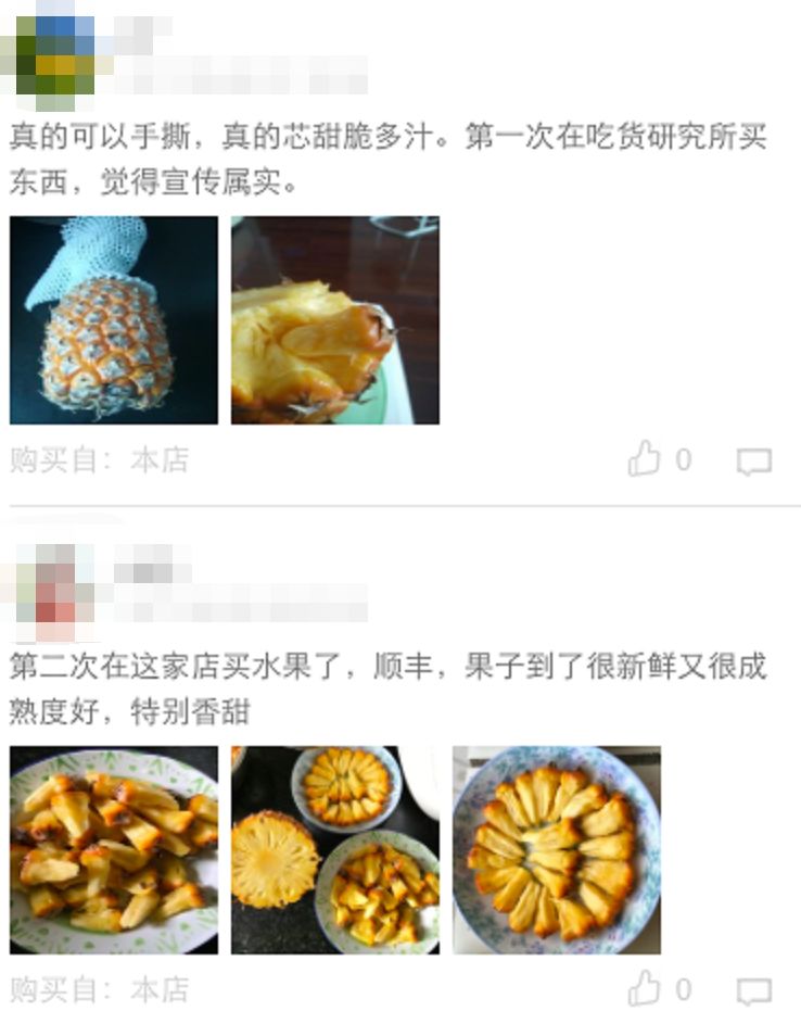 手撕菠萝是吃货小铺连续2年的明星爆品,每个批次上架都会被抢购,很快售罄,抢到的吃货们对他的评价,所长这里随便截几张图你们感受一下。