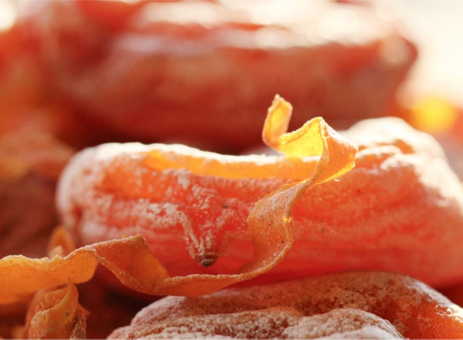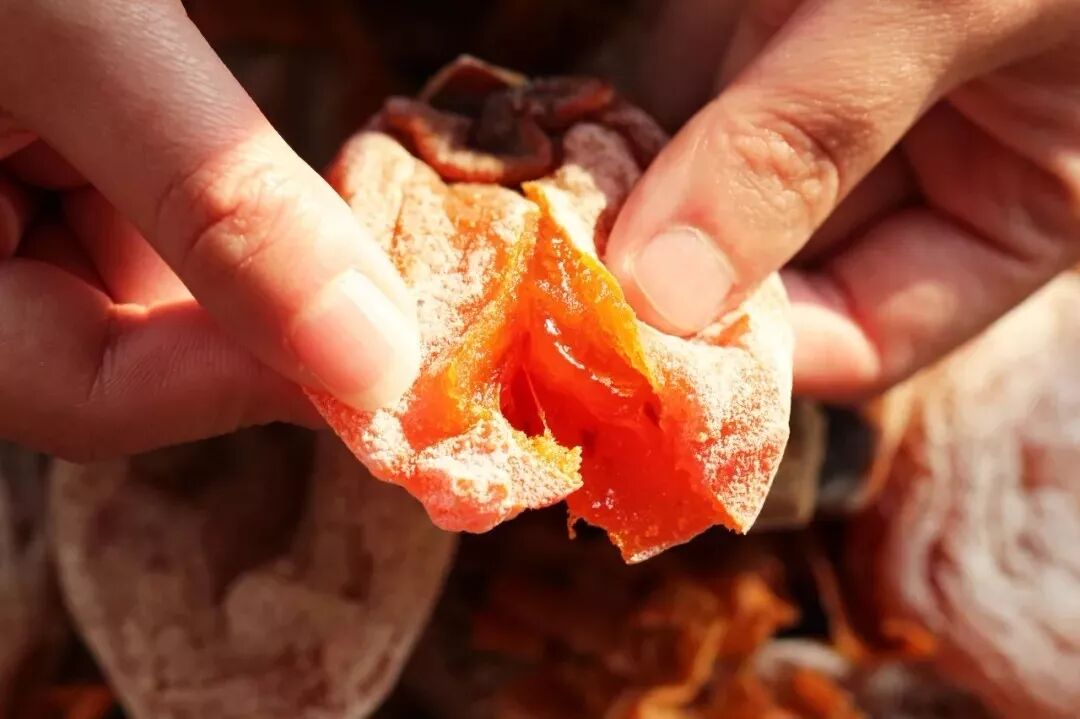 和小时候常见的圆圆扁扁的柿饼不同,所长这次挑选的是吊柿饼,它们就是柿子挂在枝头自然晾晒后的样子。它表面覆盖着一层白色的糖霜,是柿饼里的葡萄糖在低温下结晶而成,入口即化,甜而不腻。那都是柿饼努力的结果,可千万别洗掉呀!