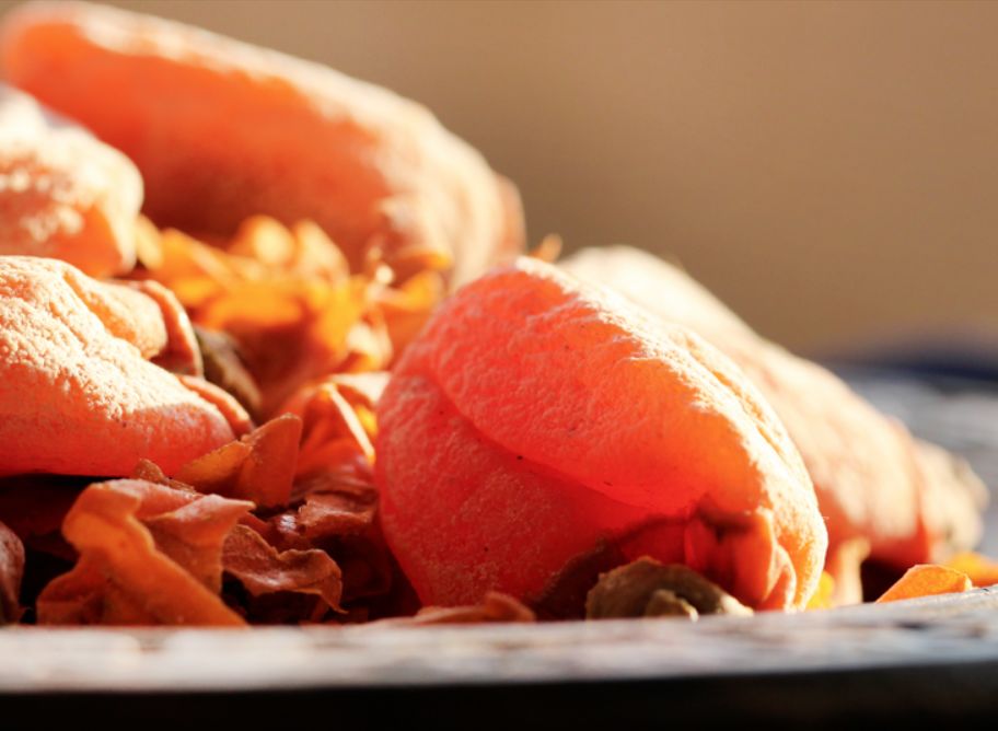 口感也不同于圆柿饼的扎实紧密,吊柿饼更软糯绵密。掰开富平柿饼,橙黄透亮的溏心果肉便爆浆而出,丰腴饱满的果肉在舌尖化开,香糯Q弹的外皮在齿间逗留,口感有嚼劲,让人欲罢不能。但记住,柿饼再好吃,也不要一次性吃太多呦!